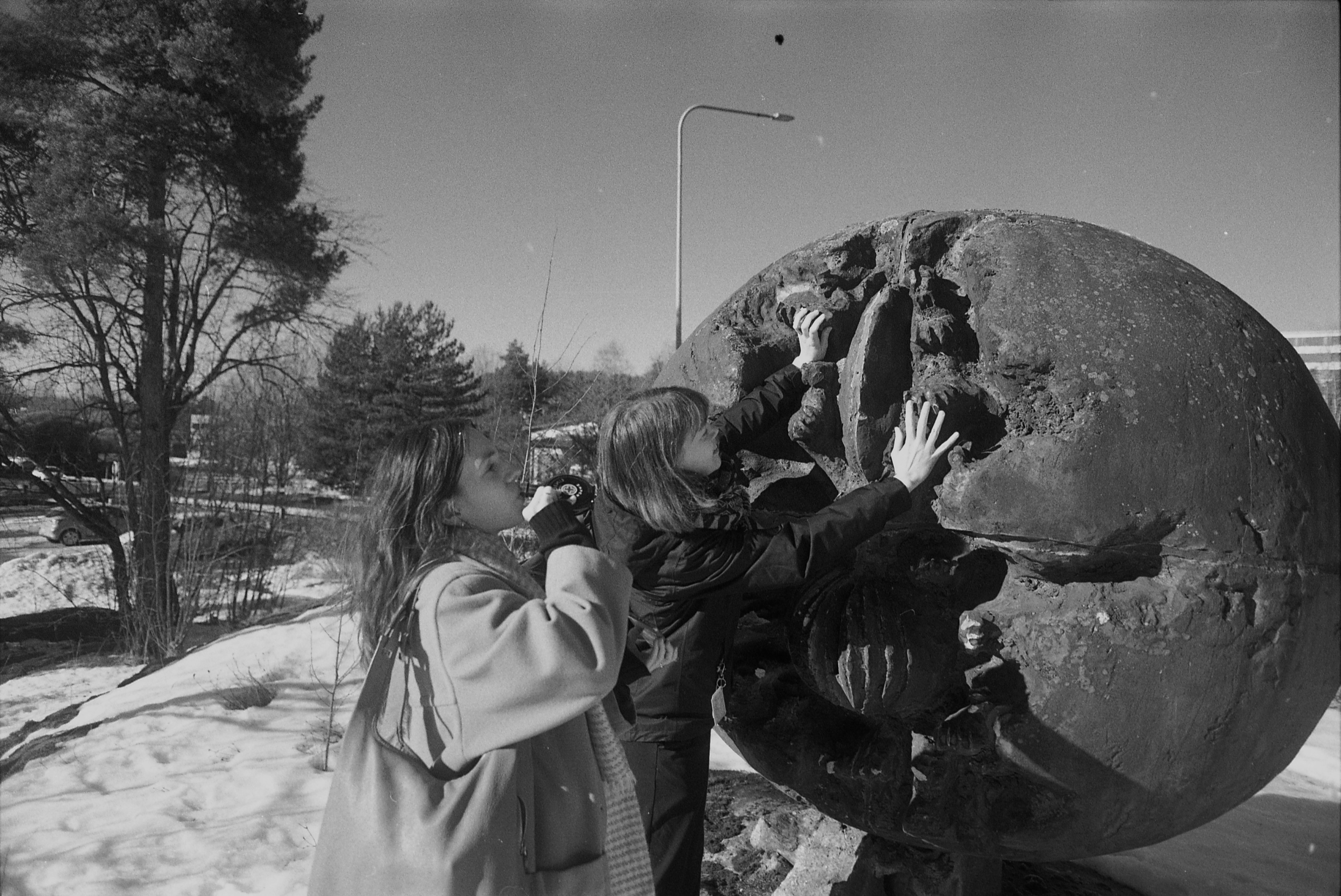 Telma huudahtaa. Hän näkee ruskean kimpaleen, joka kiiltelee kevätauringossa kuin vastaus. Toimitus tarpoo koppuraisen lumen yli munan juurelle, jossa kukaan ei ole jäljettömyydestä päätellen seisonut pitkään aikaan. Tiaiset ja Google livertävät: HAM:in sivujen mukaan veistos oli alun perin Budapestin kaupungin lahja Helsingille. Muna päätettiin pystyttää Pihlajiston tuliterään lähiöön Unkarin kansantasavallan pääsihteerin János Kádárin Suomen vierailun yhteydessä.